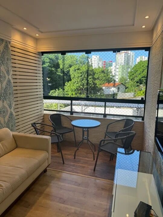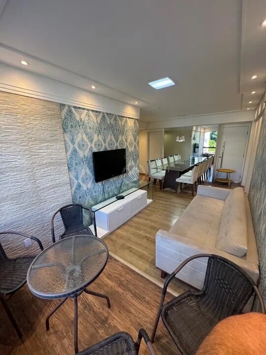 - Mesa de vidro com base madeira e 6 cadeiras (Oficina Design) - Sofá 4 lugares. - Rack - TV grande. Varanda - Mesa com 4 cadeiras.