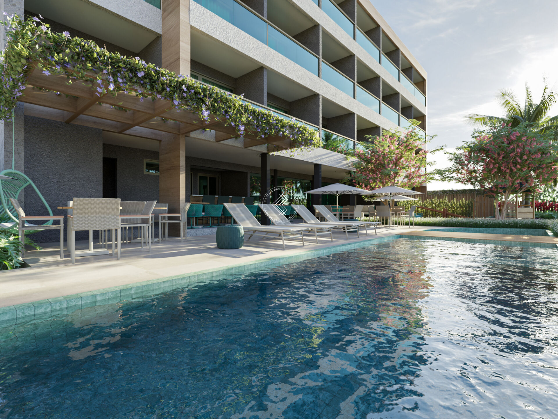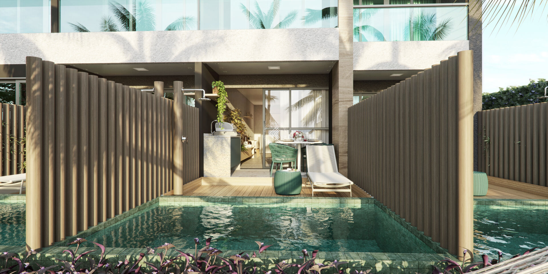 - Apartamentos no térreo com áreas de 46,80m² a 56,85m², terraço, piscina privativa com deck e garden exclusivo;